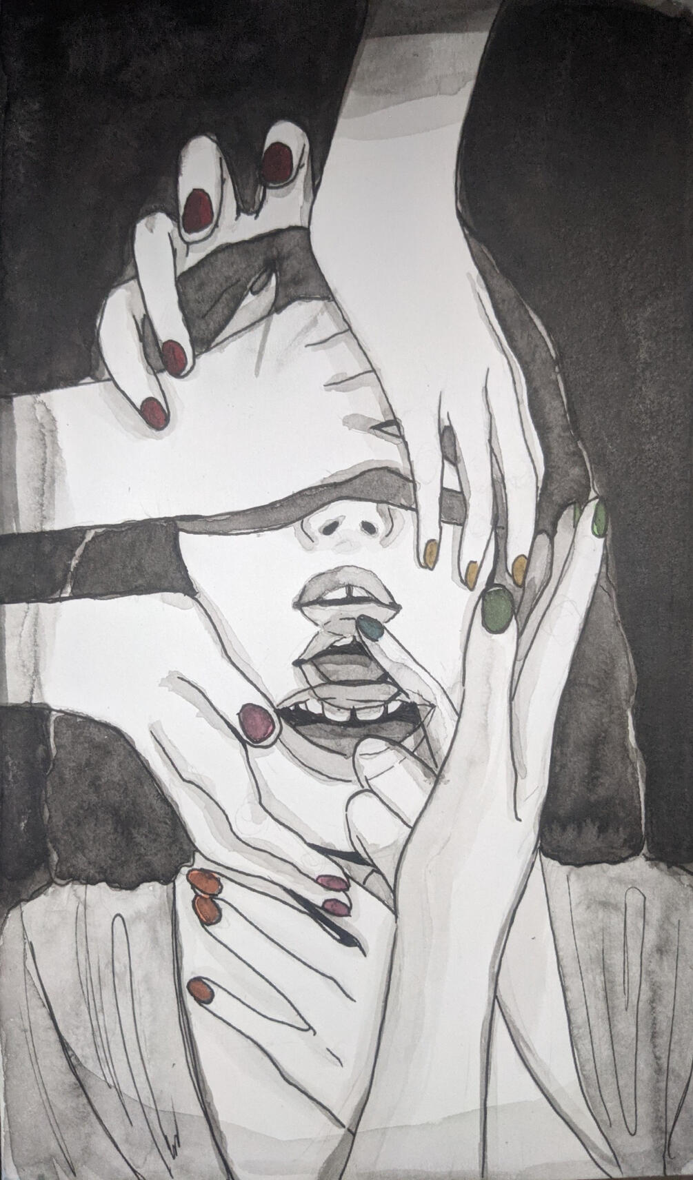 The inspiration for this project was from a situation of abuse that happened to me many years ago, I wanted to be able to draw all the feelings that I had felt all those years ago, so I took the time first to write down what emotions I remember feeling at that time, after that, I took a series of photos of myself in poses, and then edited images to layer on top to be able to see the rest of what I was imagining. After that I used water, India ink, and brushes to lay it all out, afterward outlining everything.