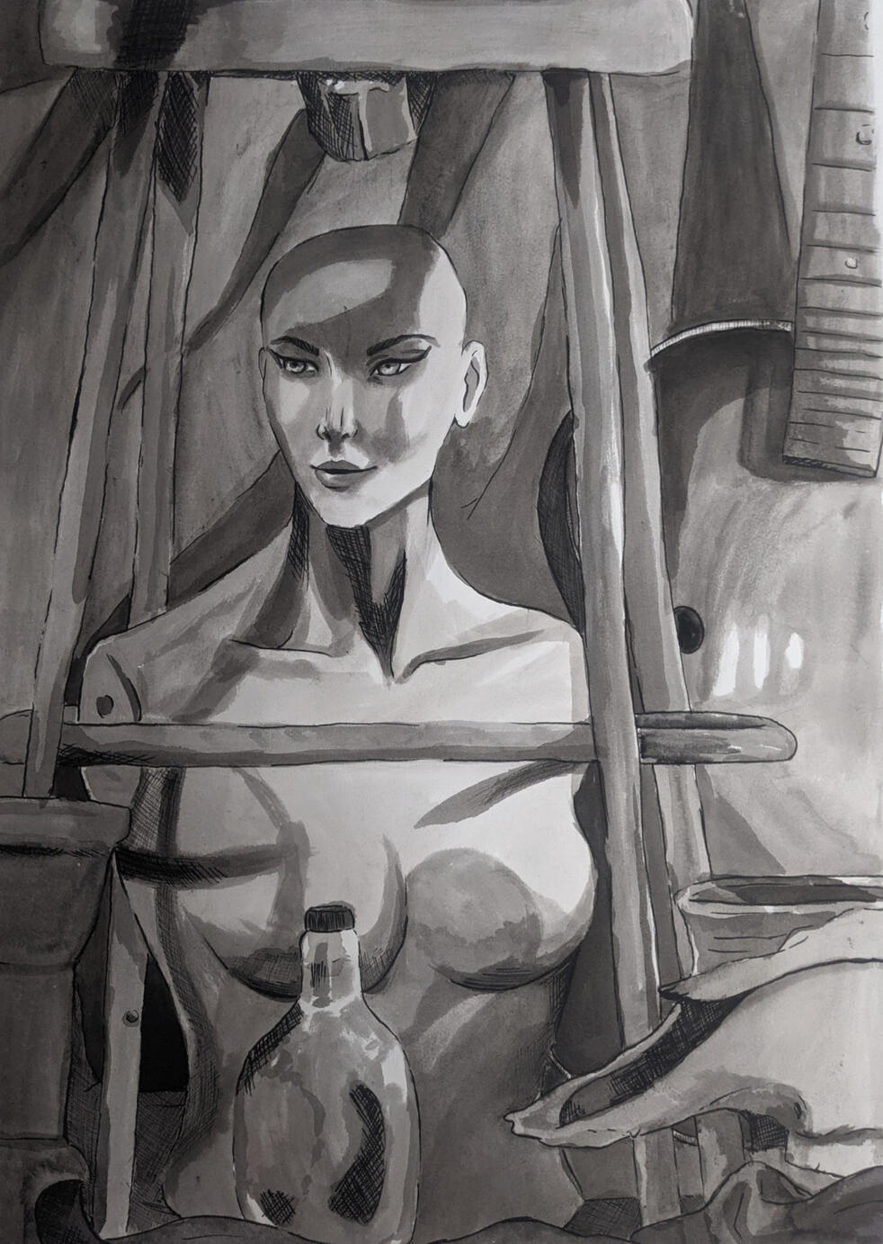 During this time I remembered watching Toy Story 3, and that feeling that the toys must have felt when being left in the attic started pushing me to make it feel cluttered and suffocating. Later putting the mannequin underneath the seat, an empty bottle in front of it, and items that seem useless, like the guitar with no strings (and this particular one also had no sound-hole), a cow skull, some empty pots, and cloth to scatter at the bottom.All of this pushed the whole painting to look tightly concentrated and filled with a meaningless feeling.